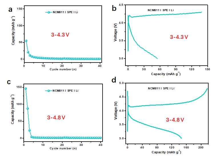 我们将NCM811与聚合物电解质、金属锂负极组装成全电池,室温0.1C下测试,得到图中的放电比容量和首圈充放电曲线,性能很差,容量从第二圈开始就骤降,充放电曲线也不正常,组装了几个电池都是如此。前期在LFP/Li(2.5-4V)是正常的,换到高压正极(3-4.8V或3-4.3V)就出现异常了,请问一下问题出在哪里? 发自小木虫Android客户端 |