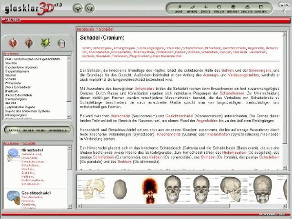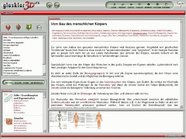 简介: 德语名:Glasklar 3D V7.0 - Der Mensch (DVD-ROM) Anatomie, physiologie und naturheilkunde 解剖学、生理学和自然疗法 多媒体透明三维人体解剖百科全书7.0版适合医科学校、个人研究和学习。各个标题包含: 数以万计数码视频、声音和图像。可自由地旋转的三维模型和评论动画可理解地容易地解释复杂多元的题目(引导浏览),帮助用户清楚理解,有效掌握知识点和小测试。准备的数字式对有效的学习控制。《透明三维人体解剖百科全书》人体的解剖学和生理, 从一个细胞的诞生到死亡。在无形的世界体验一个在浩瀚的医学人体解剖知识。 这套多媒体百科全书提供对人体的世界的一种着魔的洞察。深入到解剖没一块肌肉和骨骼,是在留德学西医中华儿女不可或缺的多媒体百科全书。 原文网址 Faszination Mensch Diese multimediale Enzyklopädie bietet einen faszinierenden Einblick in die Welt des menschlichen Körpers. Tauchen Sie tief in die Sphären von Anatomie, Physiologie und Naturheilkunde ein, und erleben Sie die Entwicklung von der befruchteten Eizelle bis ins hohe Alter. Alle Organe und Körperteile werden detailgetreu und ausführlich dargestellt. Sie finden unzählige Informationen von Akupunktur bis zu Reiki, von grundlegenden Körperfunktionen bis hin zur Zellphysiologie. Körperwissen hautnah vermittelt Die spannende Aufbereitung dieses komplexen Themenbereiches mithilfe von Videosequenzen und beweglichen 3D-Modellen macht glasklar Der Mensch zu einem zuverlässigen Begleiter während der Schulzeit, dem Studium und in der Freizeit. Die Bild- und Textdokumente machen das Lernen zu einem unterhaltsamen Abenteuer und bieten hervorragende Recherche- Möglichkeiten in diesem multimedialen Nachschlagewerk. Ein Wissens-Quiz stellt die neuen Kenntnisse nicht nur auf den Prüfstand, sondern vertieft diese noch. Lernen Sie den menschlichen Körper bis in den kleinsten Winkel kennen: Spannend, unterhaltsam und leicht verständlich. Highlights: Tausende digital aufbereitete Video-, Ton-, Bild und Textdokumente Spektakuläre, frei drehbare 3D-Modelle und kommentierte Animationen machen wissenschaftliche Themen anschaulich Komplexe Sachverhalte werden leicht verständlich erklärt Geführte Rundgänge (Guided Tours) begleiten durch vielfältige Themenbereiche Lesezeichen, umfangreiche Kopier-, Druck- und Notizfunktion Exportfunktion in alle gängigen Anwendungen über die Zwischenablage Wissens-Quiz zur effektiven Lernkontrolle und Vertiefung des Erlernten Hypertextfunktion für nichtlineare Navigation Immer aktuell durch Internetdatenbanken und Online-Updates Suchfunktion für Volltext- und Stichwortsuche Kompetent, umfassend, zuverlässig 系统要求: Windows 98SE oder höher (Windows XP empfohlen) Pentium III oder höher 32 MB Arbeitsspeicher mind. 45 MB freier Festplattenspeicher Grafik: 800x600 Auflösung, 64'000 Farben 8-fach CD-ROM-Laufwerk Soundkarte Microsoft kompatible Maus 下载地址: ed2k://|file|%5B%E9%80%8F%E6%98%8E%E4%B8%89%E7%BB%B4%E4%BA%BA%E4%BD%93%E8%A7%A3%E5%89%96%E5%AD%A6%E3%80%81%E7%94%9F%E7%90%86%E5%AD%A6%E5%92%8C%E8%87%AA%E7%84%B6%E7%96%97%E6%B3%95%E5%A4%A7%E7%99%BE%E7%A7%91%5D.Glasklar.3D.-.Der.Mensch.V7.0.DVD.rar|2530204099|68bb43fb308e2272a3a158e9bf7d4d25|/ |