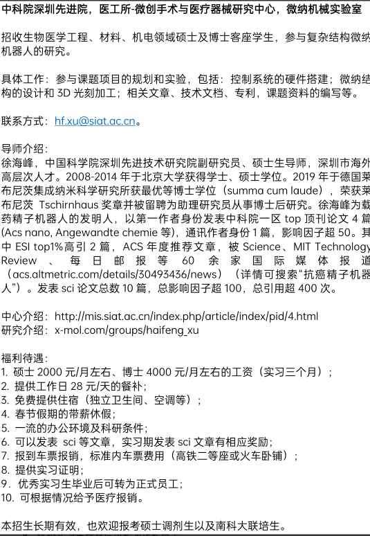 医工所-微创手术与医疗器械研究中心-微纳机械实验室 招聘高分子材料/微型机器人/生物医学工程方向客座硕士,博士研究生 生物医学工程,材料,机电等专业均可,参与复杂结构微纳机器人研究。 客座招生长期有效,欢迎报考硕士,接受国科大2022调剂生及南科大联培生。 中心介绍:https://mis.siat.ac.cn/index.php/article/index/pid/4.html 研究介绍:x-mol.com/groups/haifeng_xu 联系方式:hf.xu@siat.ac.cn 发自小木虫Android客户端 |