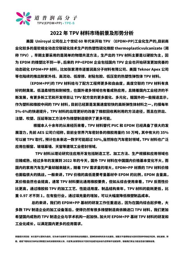 总的来讲,我们的EPDM+PP基材的研发工作任重道远,/张家港市道普润高分子的TPV材料/因为在国内综合起步晚,大多数TPV制造企业的加工设备落后,使得仍然有很多橡塑制造商依赖进口TPV材料,我们更加希望国内成熟的TPV制造企业与学术机构一起加快、加大对EPDM+PP基材TPV材料的研发和工业化成长,以满足国内更多的应用需求。郑重提示浏览者:本文是不以营利为目的、仅为本行业做学习交流的非商业性质图文,因弹性体材料的多元化属性,该图文不值得取信为您的实际参考和经济应用,请在复制、转载、或者下载有关文本时必须尊重文本的关联权利和义务、约定等;如发现有关于您的作品或作品本身为您带来不适或误导,联络我们将全力配合您进行删除处理。