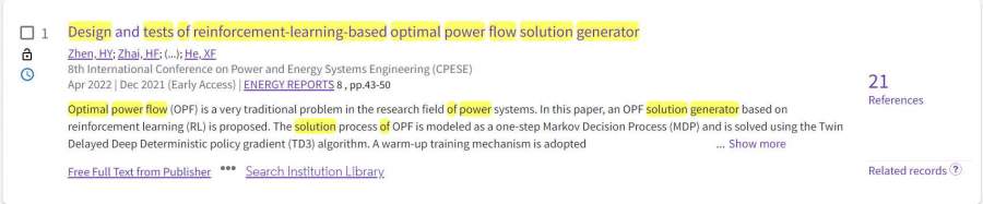 帮忙确认如下论文是否被SCI与EI索引,谢谢! 论文名称: Design and tests of reinforcement-learning-based optimal power flow solution generator 作者: HongyueZhen等 |