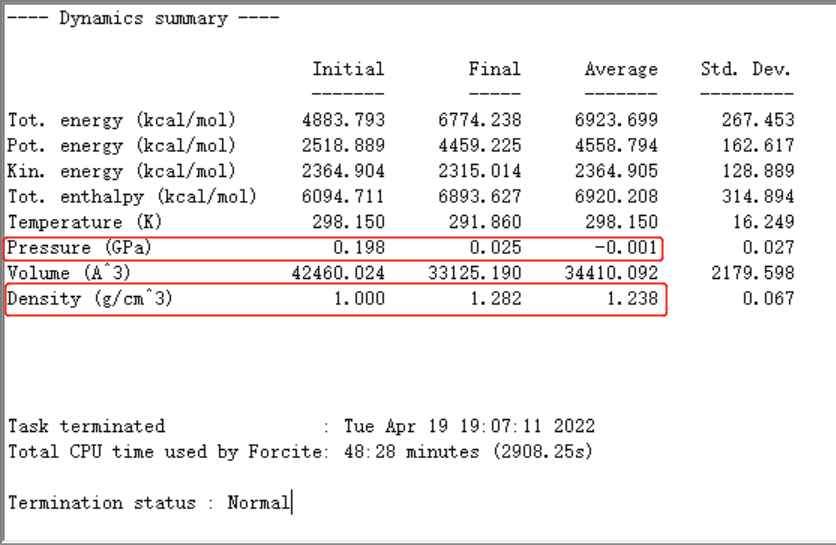 求大神指点。我想做在0.06MPa下,油分子靠近膜表面时与膜表面的作用能(实验是在一个密闭容器)。 我的做法是:将优化的油和膜放在同一个盒子,优化,退火(Quench选的NVT),最后Energy。后来觉得有0.06MPa的外压,应该用NPT吧。 请问NPT应该怎么用?或者前面的步骤有没有问题?本人新手,一点NPT就显示failed。。按文本提示改了可能存在的问题依旧failed。。求各位大佬给一个详细点的指导。 谢谢! 发自小木虫Android客户端 |