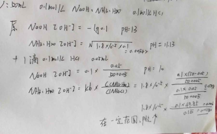 你们好,我算了一下,氨水的ph值开始是上升的。0.1摩尔每升盐酸滴定0.1摩尔每升氨水。在前15滴,ph都比原始高。理论上,加入1滴盐酸,ph最高,再加入1滴开始下降,在15滴时降到最初ph,再开始下降。你们可以用ph计监测滴定一下。回头给个反馈,,大家一起进步 发自小木虫Android客户端 |