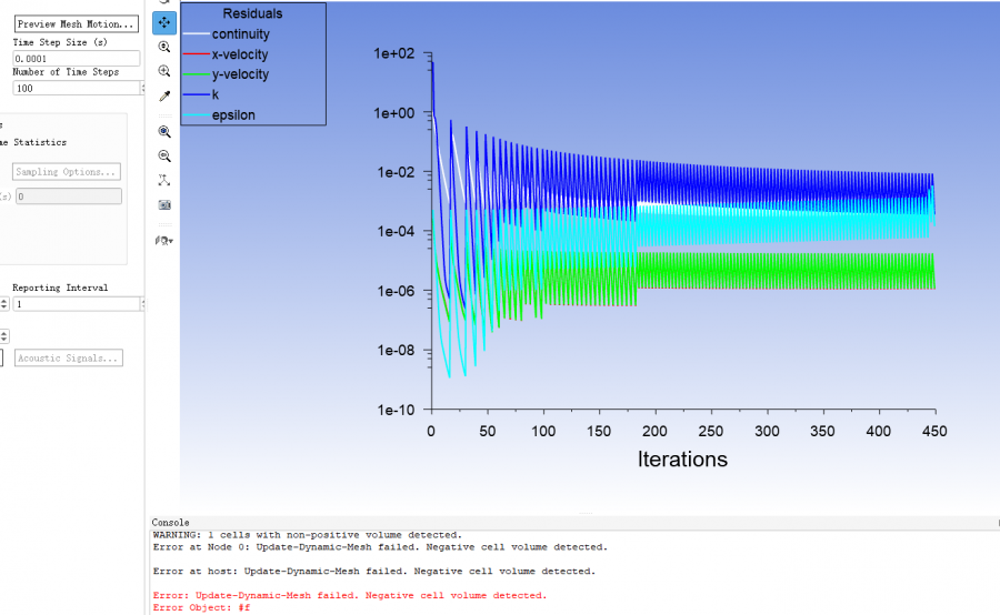 做了一个简单的二维滑移网格,时间步长设置为0.0001,只能算到100s,之后在往下算就会报错,各位大佬有知道为什么的吗?