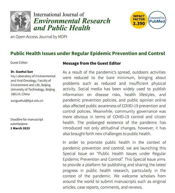 期刊是International Journal of Environmental Research and Public Health,SCI&SSCI期刊,影响因子3.39,JCR Q1区 专刊网址 https://www.mdpi.com/journal/ije ... lic_health_epidemic Message from the Guest Editor As a result of the pandemic’s spread, outdoors activities were reduced to the bare minimum, bringing about problems such as reduced and insufficient physical activity. Social media has been widely used to publish information on disease risks, health lifestyles, and pandemic prevention policies, and public opinion online also affected public awareness of COVID-19 prevention and control policies. Meanwhile, community governance was more obvious in terms of COVID-19 control and citizen health. The prolonged existence of the pandemic has introduced not only attitudinal changes, however; it has also brought forth new challenges to public health. In order to promote public health in the context of pandemic prevention and control, we are launching this Special Issue on “Public Health Issues under Regular Epidemic Prevention and Control”. This Special Issue aims to provide a platform for publishing and sharing the latest progress in public health research, particularly in the context of the pandemic. We welcome scholars from around the world to submit manuscripts such as original articles, case reports, comments, and reviews. 本专刊是本人主持,欢迎各位学者投稿,内容聚焦公共健康问题,较为宽泛。 https://pan.baidu.com/s/1pf0aRWjzZWvfOjWnd48Ttw?pwd=asdn https://pan.baidu.com/s/1QCFn2OQSyNTkSt8COc5P4g?pwd=1z4p public_health_epidemic_horizontal_light.png public_health_epidemic.jpg |