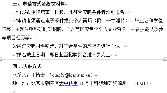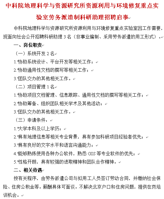 二、相关待遇 按有关程序,由劳务派遣公司与拟用工人员签订劳动合同,并缴纳社会保险、住房公积金等。薪酬具体可面谈。不解决北京户口和住房问题,提供在岗培训机会。 三、申请方式及提交材料 1. 自发布招聘启事之日起,凡符合应聘条件者均可报名。 2. 申请者须通过电子邮件提交个人简历(附:一寸照片)、毕业证和学位证等;主题注明科研助理招聘,个人简历应包含个人专业背景、主要技能以及参与项目经历等。 3. 经过应聘材料筛选,对符合条件的应聘者进行面试。 4. 报名截止日期:即日起至招聘到合适人员为止。 联系人:丁博士 (dingfy@igsnrr.ac.cn) 薪资 面议 科研助理1.png 科研助理2.png [ 来自版块群 北京 ] |
