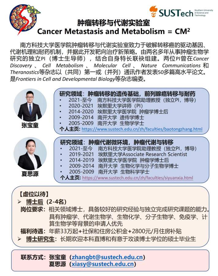 南方科技大学医学院肿瘤转移与代谢实验室张宝童-夏思源教授诚聘博士后和博士研究生