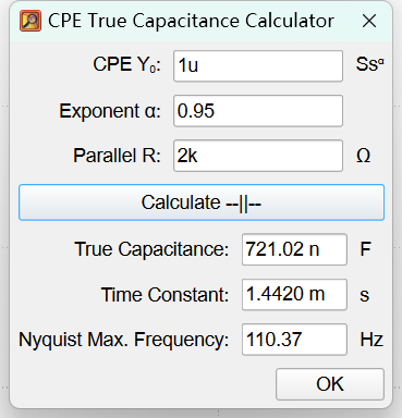 第二个小问题,请参考如下帖子: Zahner电化学仪器怎么测不同频率的电容曲线? https://muchong.com/t-15297933-1 Zahner Analysis分析软件提供计算时间常数的小工具,顶部Tools菜单,找到CPE True Capacitance Calculator,如下图: 也可以参考这份文档:交流阻抗中常相位元件 CPE 的归一化问题.pdf https://www.zahner.com.cn/filedownload/464492 20220509154416.png |