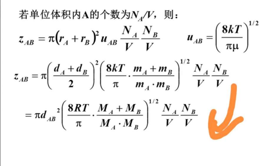 πdAB^2为碰撞截面(dAB=rA+rB),玻尔兹曼常数k乘以阿伏伽德罗常数即得理想气体常数R,基于折合质量的含义https://www.zhihu.com/question/321322874,此时折合质量的分母同乘以阿伏伽德罗常数(相应单分子质量m变成分子的摩尔质量M),右式值不变 不会贴图,供参考 |