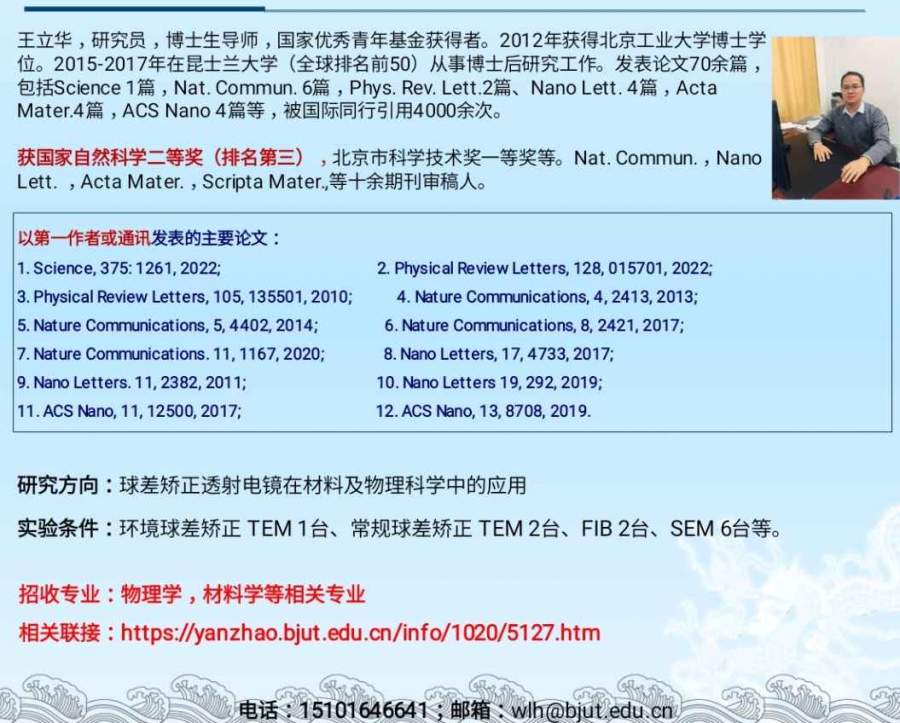 王立华,研究员,博士生导师,国家优秀青年基金获得者。获国家自然科学二等奖(排名第三),北京市科学技术一等奖。发表论文70余篇,包括Science, Nat commune, PRL等 发自小木虫Android客户端 |