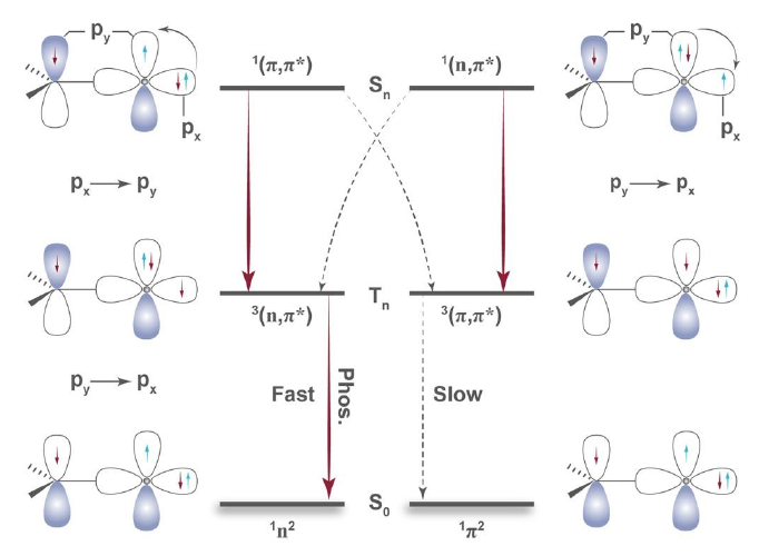 1(π,π*)是指这个state来自于分子轨域π到antibonding state π*的跃迁,假设此为S2,同理1(n,π*)为non-bonding state到antibonding state π*的跃迁。三重态同理;虚线为forbidden,实线为allowed transition。三重态回到基态的跃迁放出磷光(phos) 发自小木虫Android客户端 |