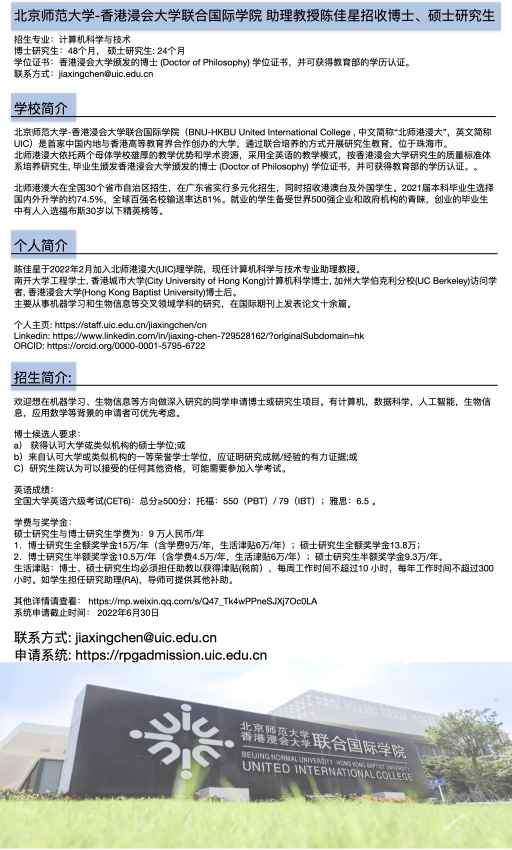 北京京师范大学-香港浸会大学联合国际学院 助理教授陈佳星招收博士、硕士研究生 招生专业:计算机科学与技术 博士研究生:48个月, 硕士研究生: 24个月 学位证书:香港浸会大学颁发的博士 (doctor of philosophy) 学位证书,并可获得教育部的学历认证。 联系方式:jiaxingchen@uic.edu.cn 学校简介 北京师范大学-香港浸会大学联合国际学院(bnu-hkbu united international college , 中文简称“北师港浸大”,英文简称uic)是首家中国内地与香港高等教育界合作创办的大学,通过联合培养的方式开展研究生教育,位于珠海市。 北师港浸大依托两个母体学校雄厚的教学优势和学术资源,采用全英语的教学模式,按香港浸会大学研究生的质量标准体系培养研究生, 毕业生颁发香港浸会大学颁发的博士 (doctor of philosophy) 学位证书,并可获得教育部的学历认证。。 北师港浸大在全国30个省市自治区招生,在广东省实行多元化招生,同时招收港澳台及外国学生。2021届本科毕业生选择国内外升学的约74.5%,全球百强名校输送率达81%。就业的学生备受世界500强企业和政府机构的青睐,创业的毕业生中有人入选福布斯30岁以下精英榜等。 个人简介 陈佳星,北师港浸大(uic)计算机科学与技术助理教授。 南开大学工程学士, 香港城市大学(city university of hong kong)计算机科学博士, 加州大学伯克利分校(uc berkeley)访问学者, 香港浸会大学(hong kong baptist university)博士后。 主要从事机器学习和生物信息等交叉领域学科的研究,在国际期刊上发表论文十余篇。 招生简介: 欢迎想在机器学习、生物信息等方向做深入研究的同学申请博士或研究生项目。有计算机,数据科学,人工智能,生物信息,应用数学等背景的申请者可优先考虑。 博士候选人要求: a) 获得认可大学或类似机构的硕士学位;或 b)来自认可大学或类似机构的一等荣誉学士学位,应证明研究成就/经验的有力证据;或 c)研究生院认为可以接受的任何其他资格,可能需要参加入学考试。 英语成绩: 全国大学英语六级考试(cet6):总分≥500分;托福:550(pbt)/ 79(ibt);雅思:6.5 。 学费与奖学金: 硕士研究生与博士研究生学费为:9 万人民币/年 1.博士研究生全额奖学金15万/年(含学费9万/年,生活津贴6万/年);硕士研究生全额奖学金13.8万; 2.博士研究生半额奖学金10.5万/年(含学费4.5万/年,生活津贴6万/年);硕士研究生半额奖学金9.3万/年。 生活津贴:博士、硕士研究生均必须担任助教以获得津贴(税前),每周工作时间不超过10 小时,每年工作时间不超过300小时。如学生担任研究助理(ra),导师可提供其他补助。 系统申请截止时间: 2022年6月30日 联系方式: jiaxingchen@uic.edu.cn 六级成绩不限时间,雅思托福时间要两年以内的,不需要考研成绩。有具体问题欢迎直接发邮件联系。 发自小木虫Android客户端 |