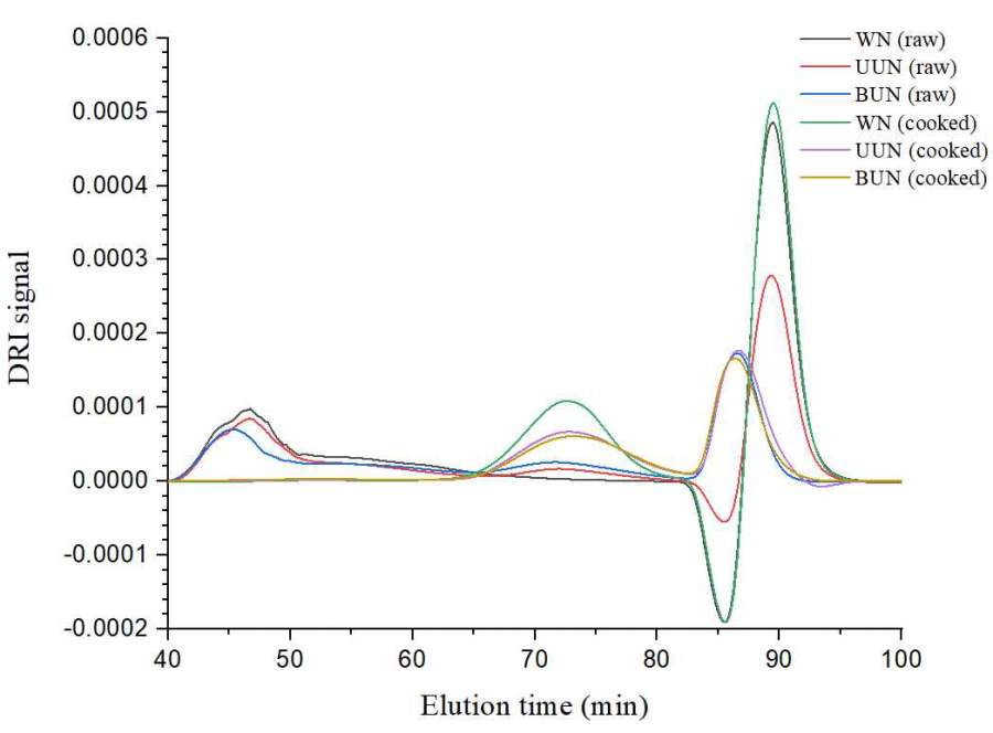 有没有大佬熟悉GPC,想请教下,为啥我的样品(WN:小麦面条,UUN: 燕麦-荞麦-小麦面,BUN:预糊化燕麦-荞麦-小麦面,流动相DMSO)有的有倒峰,有的没有?测淀粉分子量时示差折光,激光,光散射这些检测器有什么区别? 发自小木虫Android客户端 |