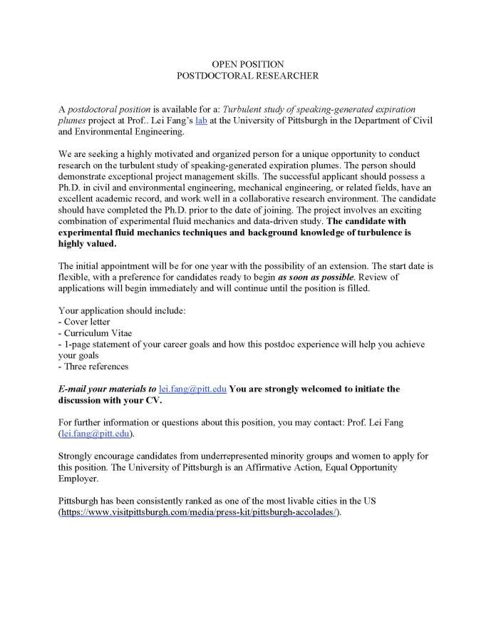 空缺职位:博士后研究员 工作地点:匹兹堡大学土木与环境工程系 课题名称:turbulent study of speaking-generated expiration plumes 呼气时的湍流研究 我们正在寻找一个积极进取的申请人,以获得一个独特的机会,对说话产生的呼气羽流的湍流现象进行研究。申请人应表现出卓越的项目管理技能。成功的申请人应拥有博士学位。在土木与环境工程、机械工程或相关领域拥有出色的学术记录,并在协作研究环境中工作良好。候选人应该已经完成了博士学位。在加入日期之前。该项目涉及实验流体力学和数据驱动研究,具有实验流体力学技术和湍流背景知识的候选人将被优先考虑。 最初的合同期限将为期一年,并有可能延长。开始日期是灵活的,优先考虑准备尽快开始的候选人。申请审查将立即开始,并将持续到职位被填补为止。 您的申请应包括: - 求职信 - 个人简历 - 一份关于您的职业目标的 1 页陈述以及此博士后经历将如何帮助您实现目标 - 三封推荐信 请将您的材料通过电子邮件发送至 lei.fang@pitt.edu 更多关于该职位的信息或问题,您可以联系:方磊教授 lei.fang@pitt.edu 强烈鼓励来自代表性不足的少数群体和女性的候选人申请该职位。匹兹堡大学是一个平权行动,机会均等的雇主。 匹兹堡一直被评为美国最宜居的城市之一 (https://www.visitpittsburgh.com/ ... tsburgh-accolades/)。 |