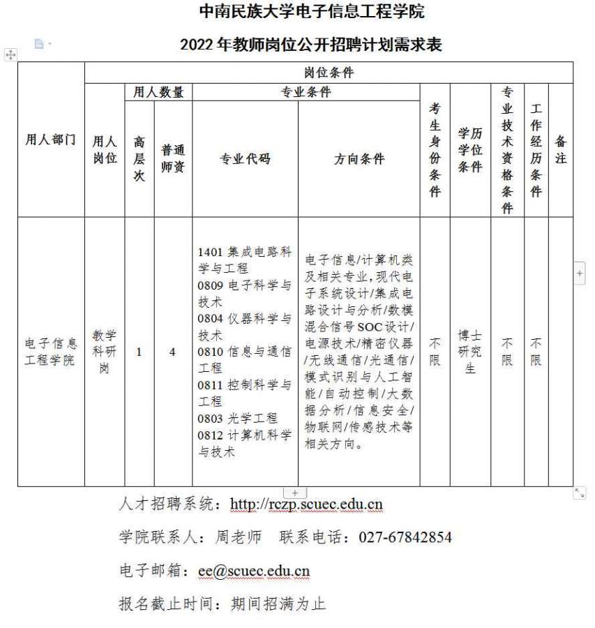 中南民族大学电子信息工程学院招聘教师