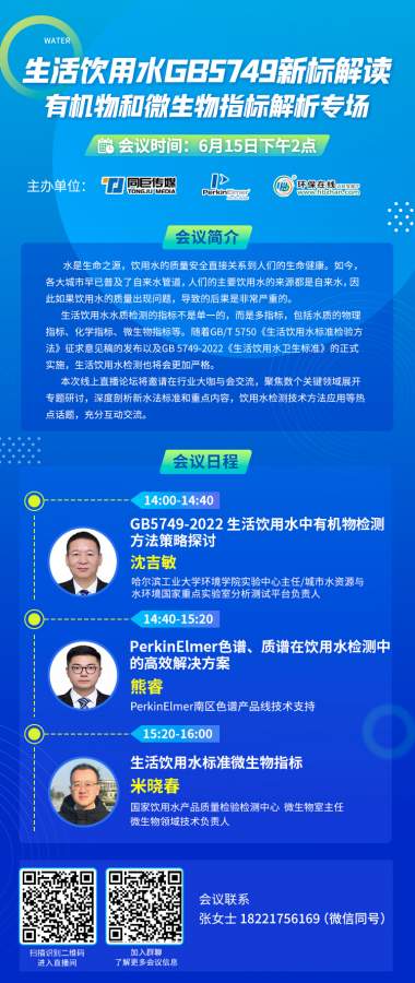 6月15日下午2点线上免费交流~ 【生活饮用水GB5749新标解读-有机物和微生物指标解析专场】 哈尔滨工业大学环境学院实验中心主任 沈吉敏教授, 国家饮用水产品质量检验检测中心 微生物室主任/微生物领域技术负责人 米晓春 继续携手珀金埃尔默一同线上详谈饮用水有机检测方法及饮用水微生物指标。 6月15日宣传图.jpg |