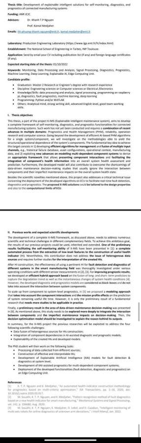 法国图卢兹综合理工大学,塔布国家工程师学院,工业生产过程实验室诚招全奖博士。 1.导师kamal medjaher: phm方向谷歌高被引学者,fmesto研究所资深研究院,lgp实验室主任,和善可亲,帅气可爱。 2.导师khanh nguyen: 全法优秀研究员,基于深度学习的phm技术研究及xai方向的杰出青年教师,宛如耐心温婉的师姐,温柔细致。 3.项目由anr jcjc资助,英文交流,可来法后选择性接受法语培训。 4.工作地点主要位于法国塔布,生活成本极低,工资喜人,办公条件优渥,与会法语或多国语言的同学双人混搭,双人办公室办公,不push,工业及学术会议频繁,学生个人学术或工业发展助益明确。 5.硬性条件,参见附件图片,主要需要在项目截止日期前取得硕士学位。 6. 有意者尽快联系: 微信:dwkkakaka, 邮箱:kamal.medjaher@enit.fr, thi-phuong-khanh.nguyen@enit.fr 发自小木虫Android客户端 |