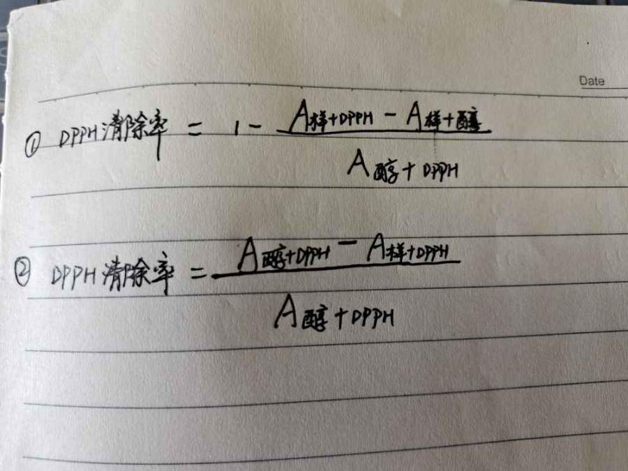 请问在测dpph清除率时,这两个公式都可以选择吗?还是说各自有自己的适用条件。 我分别用这两个公式算过同一个样品,算出来的值差距很大。 第一个公式算出来的清除率挺高的,但是不同浓度梯度的值忽高忽低; 第二个公式连阳性对照维生素C的清除率只有80%多,感觉不太对,所以很疑惑,到底应该选择哪个公式啊? 麻烦各位做过这方面的解答一下疑惑吧,求求了! @lifeliuyan 发自小木虫Android客户端 |