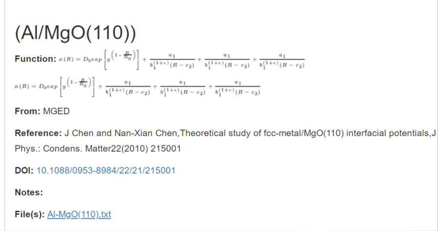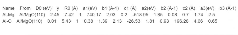 ![]() ![]() ![]() ![]() 如题,想在https://apot.mgedata.cn/Interato ... E4CA9E390754E3DC2F7这里引用Al/MgO的势参数,却看不懂这是用的什么势函数,读论文说是一种修正的对势,也就是在morse的基础上有改进,他给的参数也和morse不一样,所以即使有参数,我也不清楚在lammps中该用哪种pair_style,pair_coeff又该如何写?请各位大神帮帮忙,卡这里半个多月没进展了,被老板劈死了 ![]() ![]() (AlMgO(110)).png (AlMgO(110)).png 微信图片_20220712184227.png |