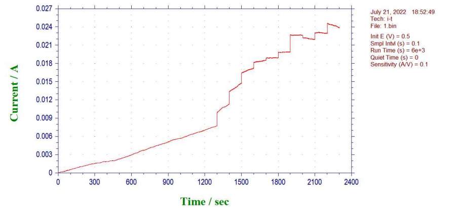 各位前辈,我用的pH7左右的电解液,工作电极是泡沫镍上生长的材料,我在用i-t法测试的时候,电流一直在增加,1300s后还稳定不下来,我就直接加检测物了,请问怎样才能让它稳定下来呀