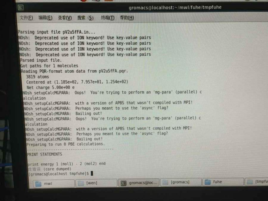 我在gromacs计算蛋白质与小分子结合能的极性溶剂化能是出错,我输入的命令g_mmpbsa -f md_nopbc.xtc -s md.tpr -n index.ndx -i polar.mdp -nomme -pbsa -decomp @smutao @oxox6085 发自小木虫Android客户端 |