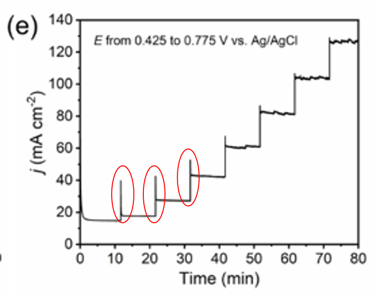 附图是铜基电催化剂在KOH中的I-t测试结果,测试电压从0.425逐渐增加至0.775 V vs. Ag/AgCl,每个电压间隔0.05V。在电压切换时,相应的电流有一个脉冲变化,想请教各位前辈,这个电流的脉冲是什么原因导致的?感谢![]() I-t测试结果.png |