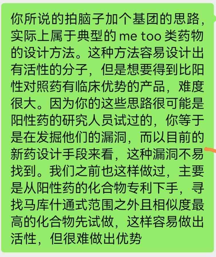 另外,合成人员还要考察新设计的化合物是否有知识产权风险。我们是企业,目前主做me better类创新药,相对于me too类的只是简单调整个别基团的改造的设计,更容易做出自己的临床优势,也符合目前国家政策的主要支持方向 发自小木虫Android客户端 |