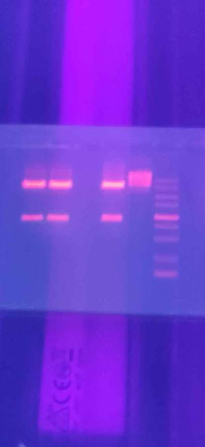 我的重组质粒转化大肠杆菌后提取质粒进行双酶切酶切位点为BamHI和XhoI,为什么我的单酶切和双酶切之后的电泳图一样呢?有条带的第一,第二泳道为双酶切,第三泳道是BamHI的单酶切,第四是没有酶切的质粒,第五泳道是marker @youlinglyw @biostar2009 发自小木虫Android客户端 |