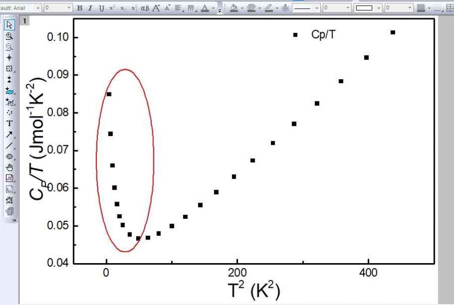 利用低温比热(2~21 K)计算Heusler形状记忆合金的德拜温度和声子系数,按照文献,Cp/T-T2曲线应该是条斜率为正的直线,但是在我材料里是一条弧线,如图所示,想问下可能的原因 发自小木虫Android客户端 |