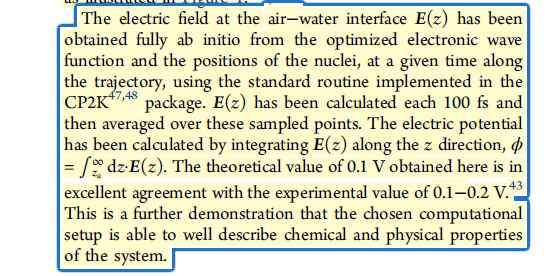各位小哥哥,各位大佬们,请教一个问题呀~ 是这样的,我的研究课题是关于水空气界面的分子动力学模拟,我花了两个月时间的摸索,才终于用256个水分子建立的水层用CP2K跑出来一个NVT的平衡构型, 像这篇文献中所展示的这样~ 然后我希望计算这些水分子在界面处产生的电场大小~ 在我所参考的文章的末尾提到了这样一段:“The electric field at the air–water interface E(z) has been obtained fully ab initio from the optimized electronic wave function and the positions of the nuclei, at a given time along the trajectory, using the standard routine implemented in the CP2K (47, 48) package. E(z) has been calculated each 100 fs and then averaged over these sampled points. ” 但是并没有具体说这个E(z)是如何得到的~好像是很容易获得的东东?所以想请教下各位,能不能教教我这个电场是怎样计算得到的呀!万分感谢大家了! 参考文献:2D H-Bond Network as the Topmost Skin to the Air–Water Interface(https://doi.org/10.1021/acs.jpclett.7b01257) 发自小木虫Android客户端 |