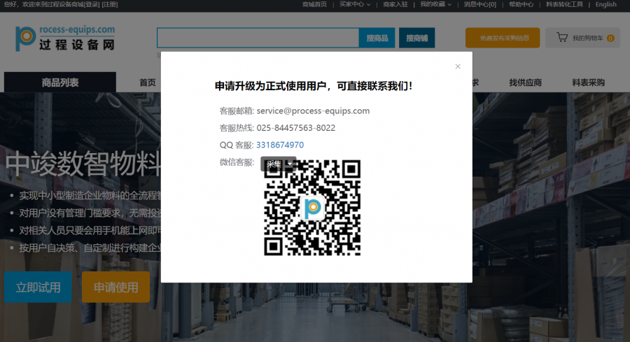登录这个网址就可以:https://www.process-equips.com/act 用过,感觉很不错,都是免费使用的。直接点击“申请使用”扫码加他们官方微信,然后跟他们说申请使用物料系统,他们就帮你免费部署一套系统。亲测过。 1.png 2.png 3.png 4.png |