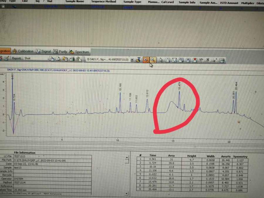 我的液相色谱图,中间这一块老凸起,不进样的话是没有的,加不加保护柱都一样。流动相是乙腈和0.1甲酸,这一块梯度很缓。关键是他前面后面都比较平,就这一块凸起很奇怪,有知道的小伙伴可以解答一下吗。样品是0.22微米滤膜过滤的,色谱柱是1.8微米的超高效液相色谱柱 发自小木虫Android客户端 |