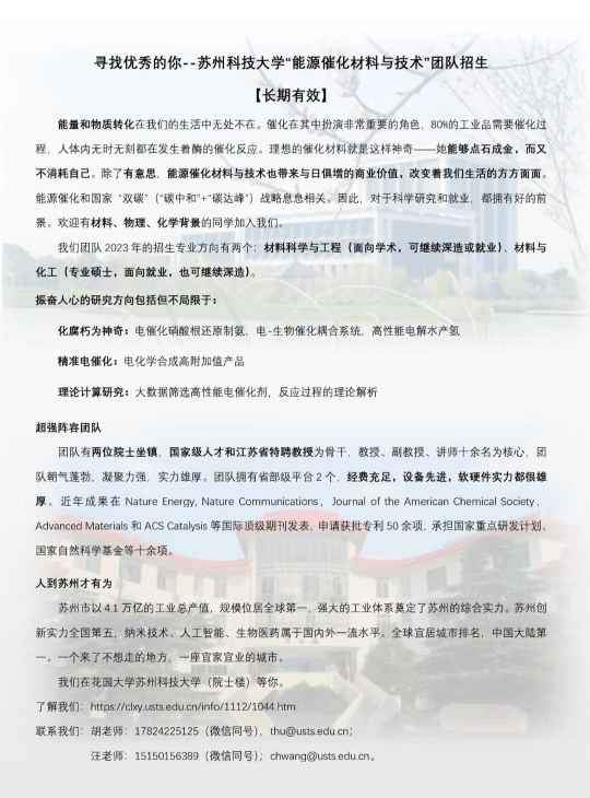 能源催化材料与技术团队研究生招生,坐标苏州