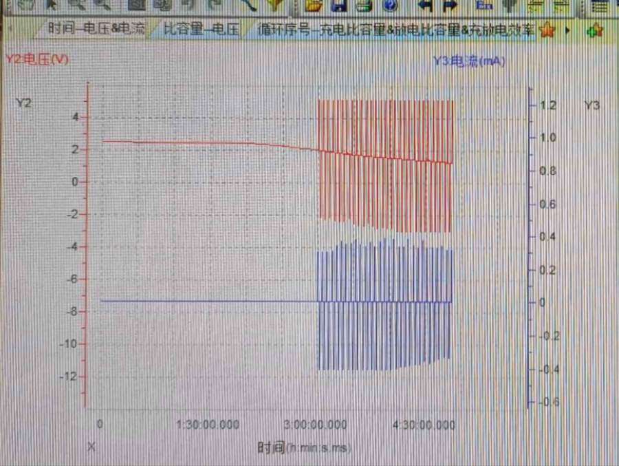 最近在尝试制备固态软包电池,充放电之前搁置了3h,之后充放电的时候出现了图中的情况,大概1h40min后电压缓慢下降,之后3h开始充放电时电压瞬间充到了设定值,之后又很快变成负值了,容量基本为零,完全一头雾水orz,组内的师兄姐也都不做该方向,跪求大神指点。 发自小木虫Android客户端 |
