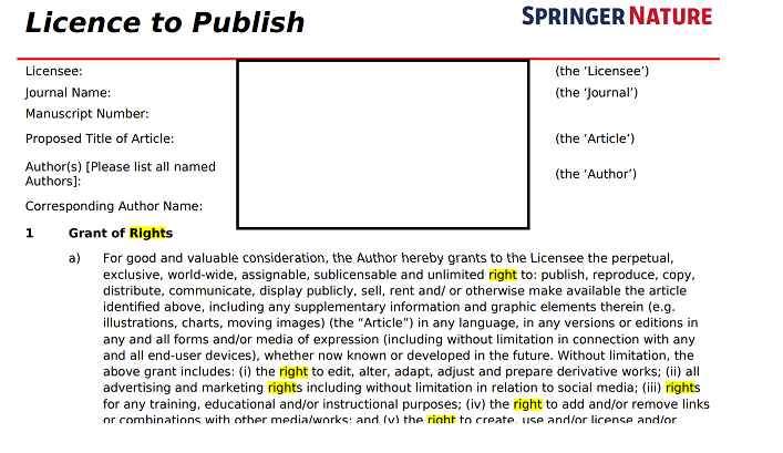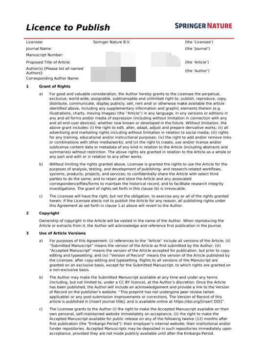 本人第一次proof springer旗下的论文,现在在线提交页面需要我提供 Copyright Transfer Form ,但是本笨比在官网上找不到,希望各位虫友能够帮忙解惑!! 我选择的是订阅模式,Copyright Transfer Form下面显示if applicable,说明是可以不提交吗?另外,收到了一个邮件是Licence to Publish,请问这个是不是Copyright Transfer Form? 谢谢各位虫友!! 发自小木虫Android客户端 |