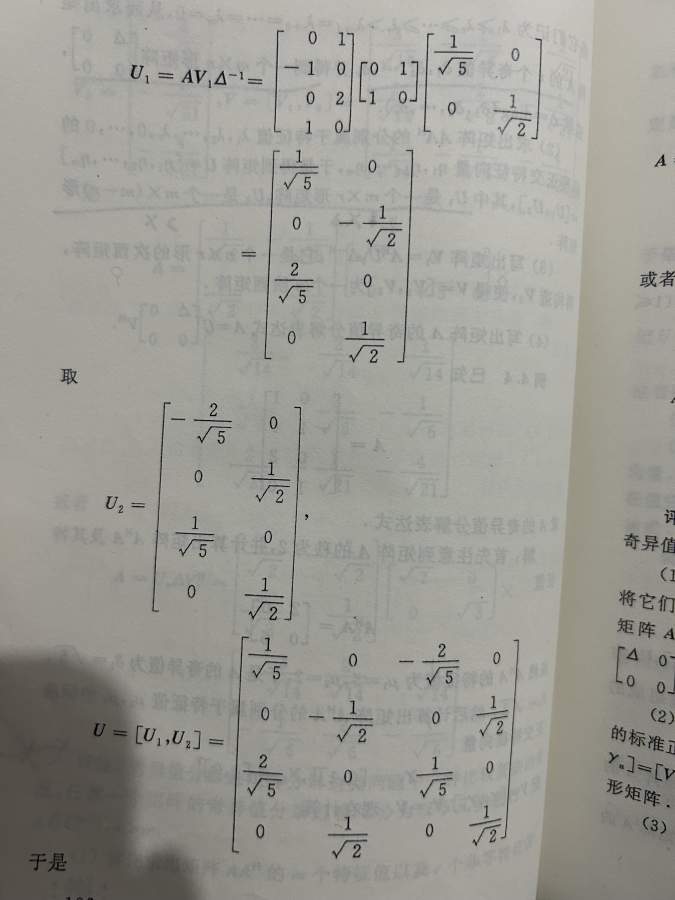 矩阵分析(史荣昌编写)第四章矩阵奇异值分解中有个地方不明白。 已经算出次酉矩阵U1,书本直接取U2,让U=[U1 U2],U是酉矩阵,如图所示,这个U2是怎么来的,或者怎么算快速一些? 根据UHU=UUH=E吗? 1.jpg |