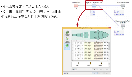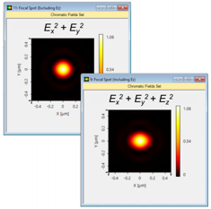 高NA物镜广泛用于光学光刻,显微镜等。因此,在聚焦仿真中最基本的就是考虑光的矢量性质。 使用VirtualLab对这种镜头进行光线追迹和场追迹分析非常方便。通过场追迹,可以清楚地展示不对称焦斑,这源于矢量效应。相机探测器和电磁场探测器为聚焦区域的研究提供了充分的灵活性,可以让用户深入了解矢量效应。