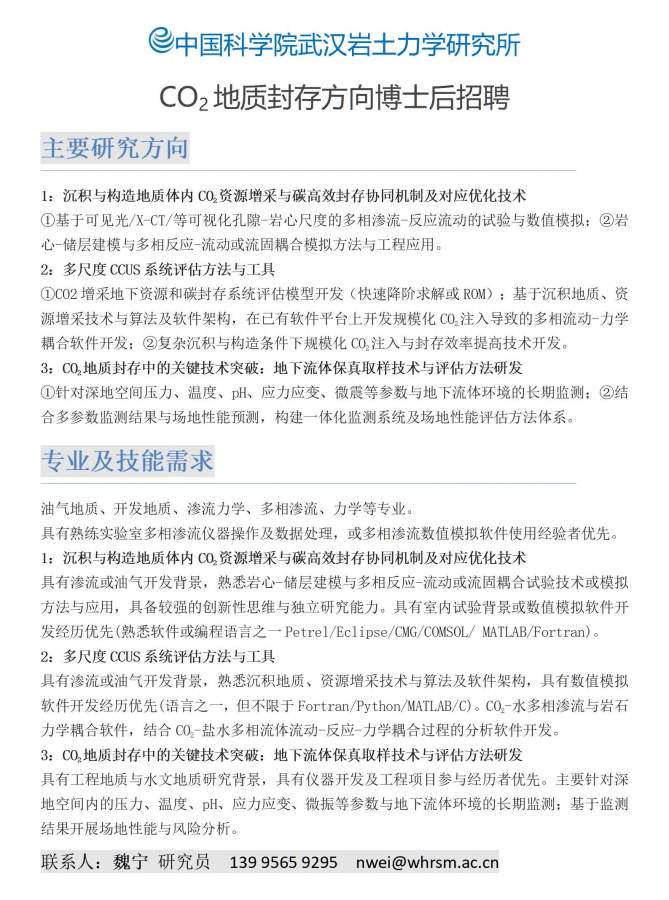 招聘信息:不限硕士/博士/博士后/科研助理等,共同解决问题。 主要研究方向 1:沉积与构造地质体内 C0,资源增采与碳高效封存协同机制及对应优化技术 ①基于可见光/X-CT/ 等可视化孔隙-岩心尺度的多相渗流-反应流动的试验与数值模拟;②岩心-储层建模与多相反应-流动或流固耦合模拟方法与工程应用。 2:多尺度 CCUS 系统评估方法与工具 ①CO2增采地下资源和碳封存系统评佔模型开发(快速降阶求解或 ROM);基于沉积地质、资源增采技术与算法及软件架构,在己有软件平合上开发规模化CO2注入导致的多相流动-力学 赮合软件开发:②复杂沉积与构造条件下规模化CO2注入与封存效率提高技术开发。 3:CO2地质封存中的关键技术突破:地下流体保真取样技术与评估方法研发 ①针对深地空问压力、温度、pH、应力应变、微震等参数与地下流体环境的长期监测:②结合多参数监测结果与场地性能预测,构建一体化监测系统及场地性能评估方法体系。 专业及技能需求 油气地质、开发地质、渗流力学、多相渗流、力学等专业。 具有熟练实验室多相渗流仪器操作及数据处理,或多相滲流数值模拟软件使用经验者优先。 1:沉积与构造地质体内CO2资源增采与碳高效封存协同机制及对应优化技术 具有渗流或油气开发背景,熟悉岩心-储层建模与多相反应-流动或流固耦合试验技术或模拟方法与应用,具备较强的创新性思维与独立研究能力。具有室内试验背景或数值模拟软件开发经历优先(熟悉软件或编程语言之一 Petrel/Eclipse/CMG/COMSOL/ MATLAB/Fortran)。 2:多尺度CCUS系统评估方法与工具 具有渗流或油气开发背景,熟悉沉积地质、资源增采技术与算法及软件架构,具有数值模拟软件开发经历优先(语言之一,但不限于 Fortran/Python/MATLAB/C)。CO2水多相渗流与岩石力学耦合软件,结合 CO2盐水多相流体流动-反应-力学玛合过程的分析软件开发。 3:CO2地质封存中的关键技术突破:地下流体保真取样技术与评估方法研发 具有工程地质与水文地质研究背景,具有仪器开发及工程项目参与经历者优先。主要针对深地空间内的压力、温度、pH、应力应变、微震等参数与地下流体环境的长期监测;基于监测结果开展场地性能与风险分析。 联系人:魏宁 邮箱:nwei@whrsm.ac.cn a招聘信息.jpg |