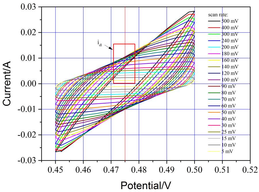 求助各位老师和同学:最近在学习使用Ir-Ta DSA 电极,想利用双电层电容法测试其电化学比表面积,发现随着扫速越来越大,CV的轮廓越来越窄,同时图中红色方框内的阳极电流不增反降,是因为DSA电极可暴露的外表面的双电层也在降低吗? 求助帖2.jpg |