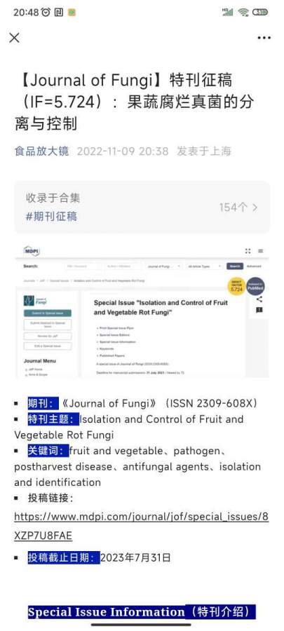 Journal of fungi(影响因子5.724,Q1)特刊“果蔬致病真菌分离与控制”征稿,欢迎各位老师投稿,审稿效率高!投稿截止日期2023年7月31日! 发自小木虫Android客户端 |