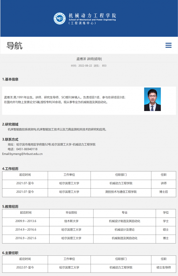 【哈理工;硕士;导师;招生】 学校:哈尔滨理工大学 专业:机械制造及其自动化 导师姓名:孟博洋 招生人数:2-3人 招生时间:每年考研分数线公布后 联系方式:bymeng@hrbust.edu.cn 研究方向:智能机床数控系统,智能切削加工相关技术 个人主页:https://jixie.hrbust.edu.cn/2022/0822/c2041a73821/pagem.htm 招生条件:不限学校,机械专业,零基础手把手教学,只要有科研热情,积极向上的同学,都可提前联系。 ps1:当上师兄后必须要照顾同门师弟 ![]() ps2:平等尊重,共同进步,非诚勿扰! 一志愿考生:每年考研分数线公布后,可直接联系确认名额。 调剂考生:需确认成功调剂来校后,联系我确认导师招生名额。 截止2023.3.15-22:00调剂有希望的邮件均已回复,收到邮件后可考虑是否调剂。 去年调剂要求参考网址:https://jixie.hrbust.edu.cn/2022/0409/c2086a70287/page.htm [ last edited by by.meng on 2023-3-15 at 22:08 ] 2023年3月27日补充,机制专硕名额目前紧张,学硕尚有调剂名额 [ last edited by by.meng on 2023-3-27 at 12:13 ] 学硕有调剂名额,专硕名额极少!! [ last edited by by.meng on 2023-3-27 at 20:28 ] 2023年哈理工调剂信息已发布 https://graduate.hrbust.edu.cn/2023/0328/c3907a85124/page.htm [ last edited by by.meng on 2023-3-28 at 16:38 ] 机械制造及自动化学硕调剂名额25,专硕调剂名额5 [ last edited by by.meng on 2023-3-29 at 23:04 ] 机械制造及自动化学硕调剂名额25,专硕调剂名额5 [ Last edited by by.MENG on 2023-3-29 at 23:04 ] |