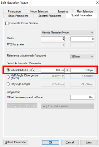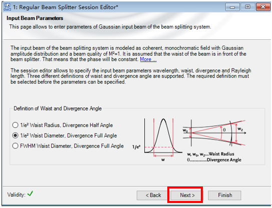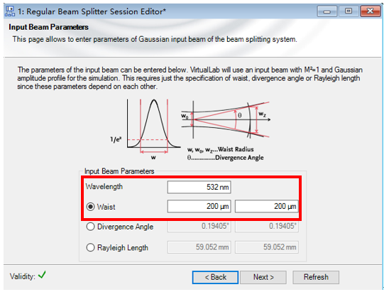 2) 点击Next,设置输入光束参数,选择束腰和发散角定义类型为1/e2 Waist Diameter, Divergence Full Angle,先设置波长为532nm,后期对光源参数进行更改,腰束直径为200um。