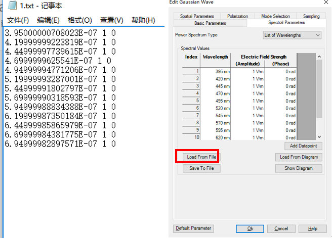 通过load from file将已有的txt文档导入生成多波长功率谱