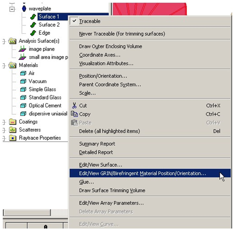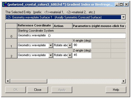 方解石材料的波片以其快轴的方向分成全局坐标系的x轴和y轴两个方向。同样用于透镜的双折射材料定义也可以用于波片中,通过 "edit/view grin/birefringent position/orientation"对话框将坐标转换成波片表面。