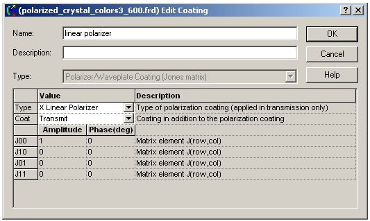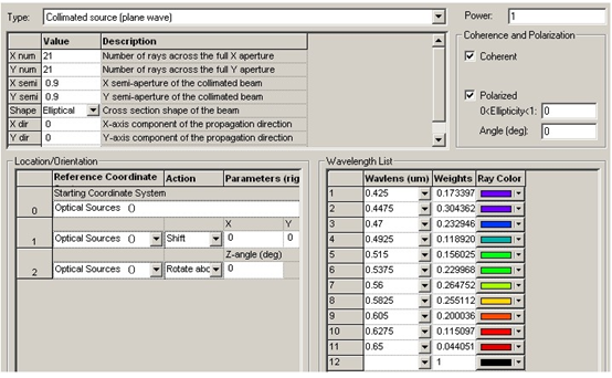 光源是相干的,准直的沿全局坐标系y轴的方向偏振。"synthesize a color"(合成一种颜色)的功能是用来创建和权衡模拟“白色”的均匀空间波长范围。
