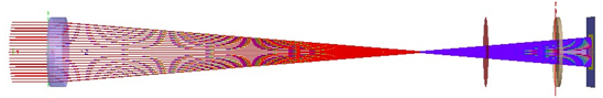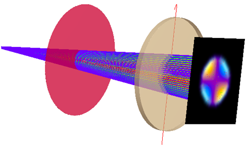 这个例子说明了光通过双折射元件会造成空间色彩分离。偏振白光入射到一个用方解石(一种单轴晶体)做的简单镜头上,汇聚的光束继续通过波片和偏振元器件上,被屏幕拦截。fred中的彩色图像特征用来显示空间光谱分布。