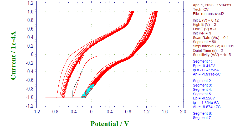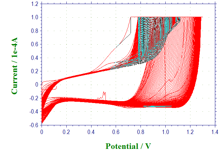 求助大神,我用电化学工作站做循环伏安曲线为什么电流总是在1A到-1A之间,不能形成一个回路,这是什么原因造成的,可以怎么改变一下
