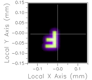 在往下看是内置的脚本用来修改屈光度,使其为4(250mm),光源“Letter F”在视网膜处生成一个字母为F的图像。绿色的光线聚焦的非常好而红色和蓝色光线有一点的模糊。使用Positions Spot Diagram分析工具来观察最为合适。