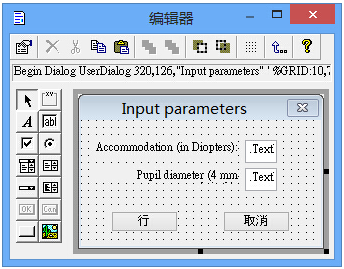 内置脚本使用对话框显示屈光度和光瞳直径的数值设置。使用FRED Basic脚本创建和使用对话框非常容易。图6显示了如何获取用户自定义对话框,如下图所示: