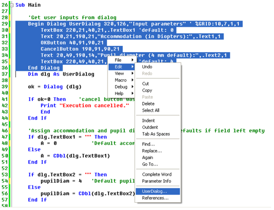 如果“OK”按钮按下,将会核对对话框下面的代码行,如果点击取消则脚本终止。然后输入的参数赋予变量,如果此处是保留为空白,则使用默认值。因此,如果没有值输入并点击“OK”按钮,则脚本是以屈光度为0,光瞳直径为4mm来运行的。